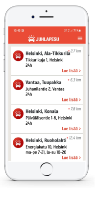 Juhlapesun asiakkaana saat käyttöösi kaikki Juhlapesu-verkoston autopesulat ympäri maan. Voit pyyhkäistä auton pesuun missä tahansa, milloin tahansa. Kaikki pesulat ovat auki kellon ympäri, paitsi kumppanuusverkoston Pesupaikat Ruoholahdessa sekä Leppävaarassa ovat auki ma-pe 7-22, la-su 9-21. Reaaliaikainen jonotilanne auttaa sinua valitsemaan parhaan paikan ja ajan. Yhdellä applikaatiolla ajat pesuun samalla tavalla kaikissa pesupaikoissa.