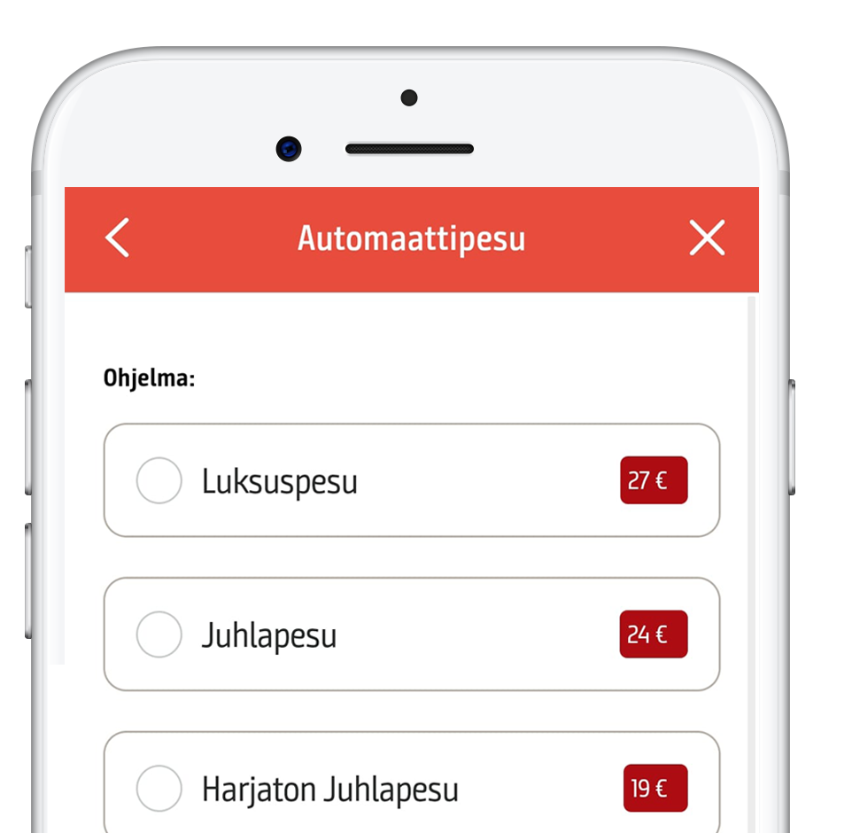 Ei enää poletteja tai hankalia ohjelmavalintoja. Autosi tunnistetaan pesulan ovella automaattisesti ja voit ajaa pesuun autosta nousematta. Kiinteällä kuukausimaksulla ajat aina puhtaalla autolla. Käytössäsi kaikki Juhlapesu-verkoston pesulat. Aloita asiakkuus lataamalla Juhlapesu-applikaatio tai valitse ja maksa pesu autopesuloilta löytyvillä maksuautomaateilla. Pyyhkäise auto pesuun jo tänään!